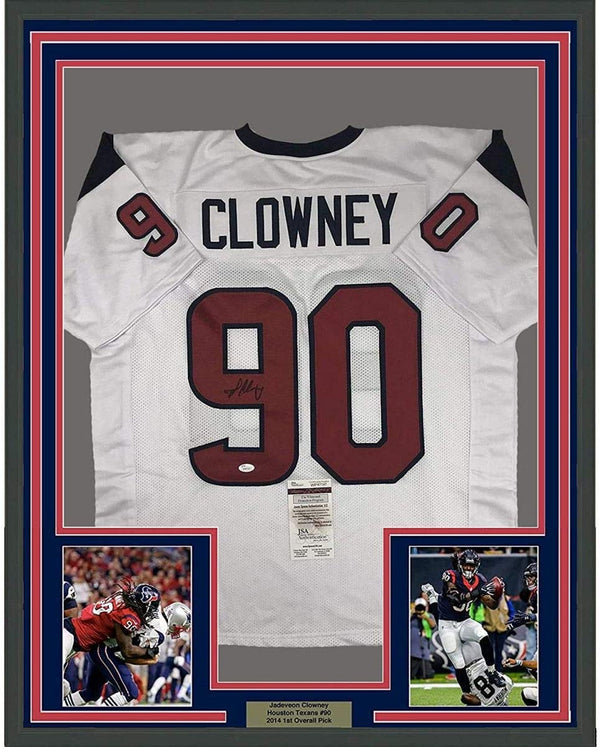 Framed Autographed/Signed Jadeveon Clowney 35x39 Houston White Football Jersey JSA COA