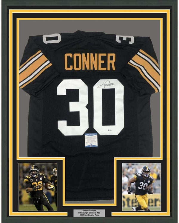 Framed Autographed/Signed James Conner 35x39 Pittsburgh Black Football Jersey Beckett BAS COA