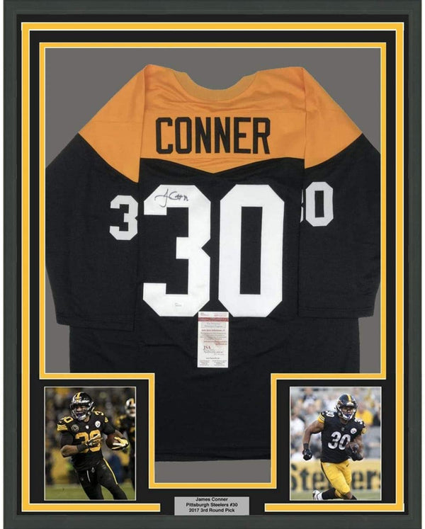 Framed Autographed/Signed James Conner 35x39 Pittsburgh Retro Black Football Jersey JSA COA