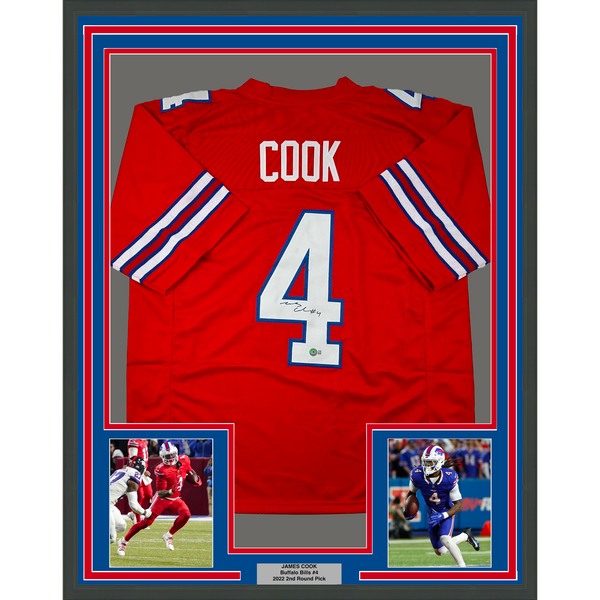 Framed Autographed/Signed James Cook 35x39 Buffalo Red Football Jersey Beckett BAS COA