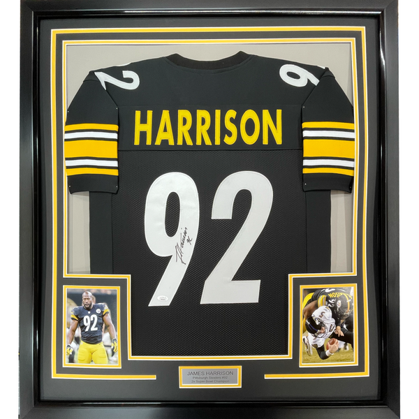 Framed Autographed/Signed James Harrison 35x39 Pittsburgh Black Football Jersey Beckett BAS COA