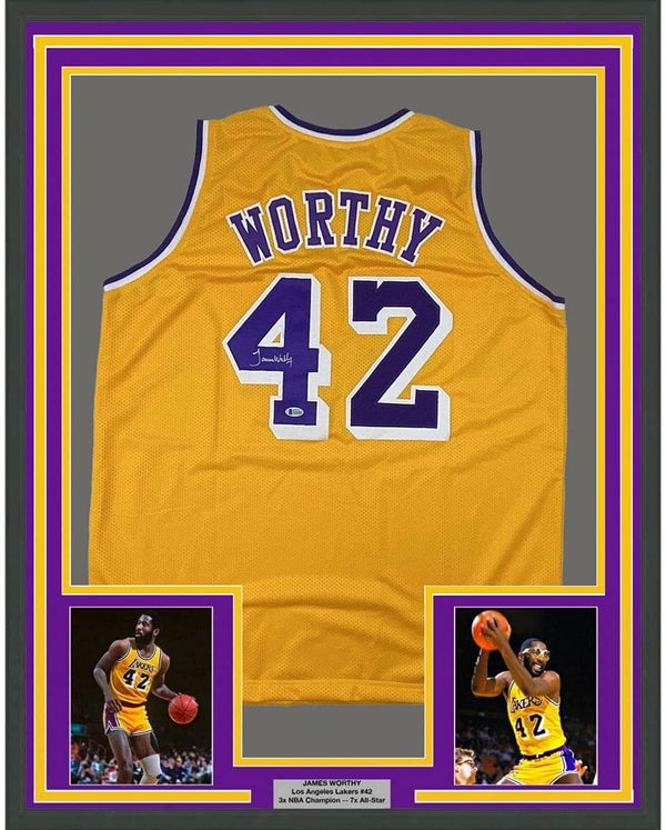 Framed Autographed/Signed James Worthy 35x39 Los Angeles LA Yellow Basketball Jersey Beckett BAS COA