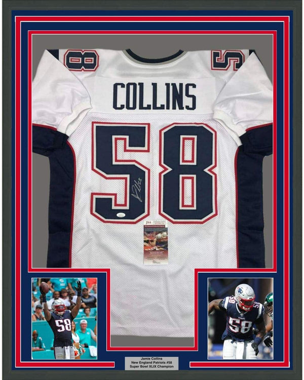 Framed Autographed/Signed Jamie Collins 35x39 New England White Football Jersey JSA COA