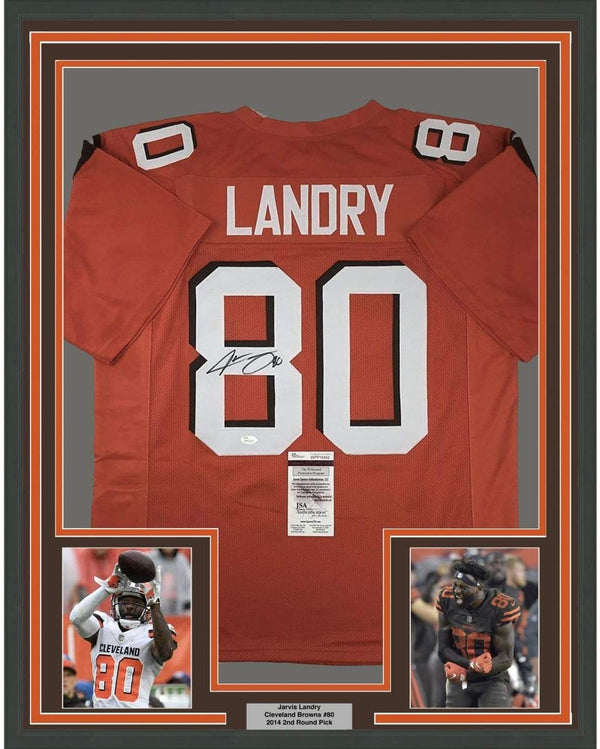 Framed Autographed/Signed Jarvis Landry 35x39 Cleveland Orange Football Jersey JSA COA