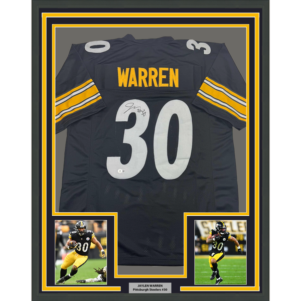 Framed Autographed/Signed Jaylen Warren 35x39 Pittsburgh Black Football Jersey Beckett BAS COA