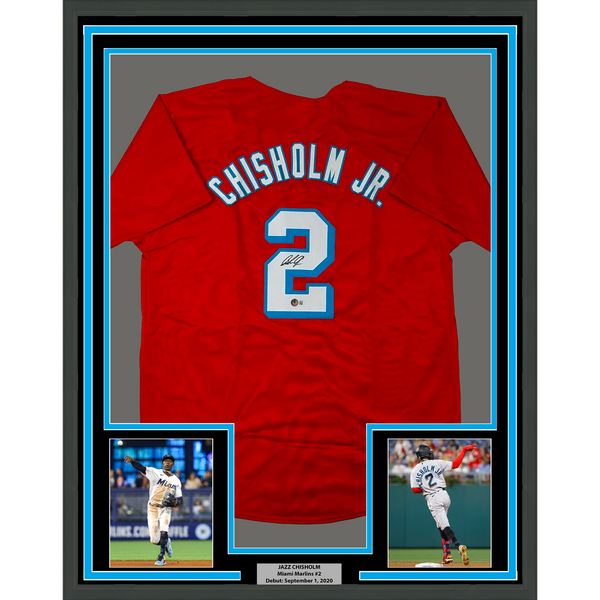 Framed Autographed/Signed Jazz Chisholm Jr. 35x39 Miami Red Baseball Jersey Beckett BAS COA