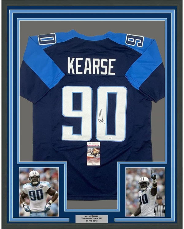 Framed Autographed/Signed Jevon Kearse 35x39 Tennessee Dark Blue Football Jersey JSA COA
