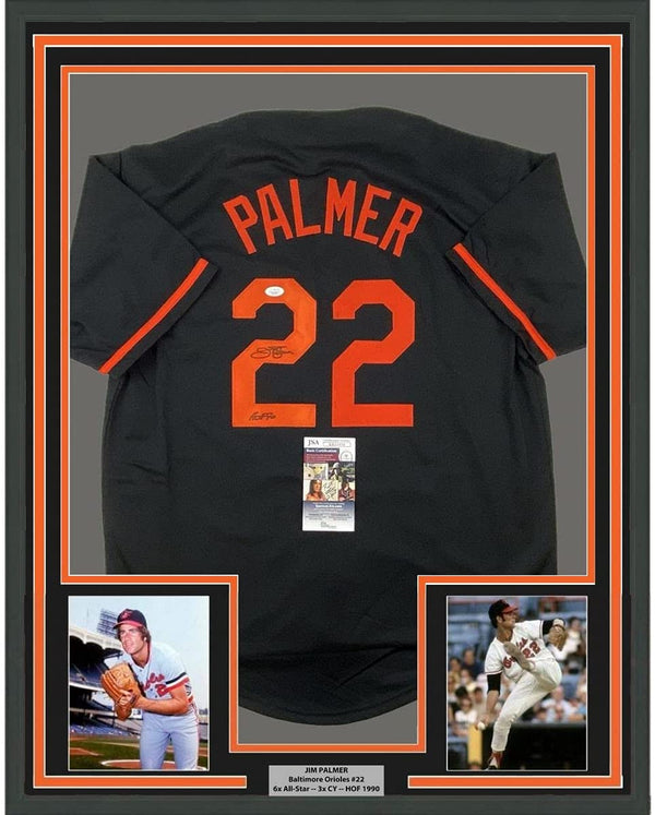 Framed Autographed/Signed Jim Palmer HOF 1990 35x39 Baltimore Black Baseball Jersey JSA COA