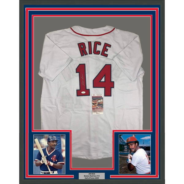Framed Autographed/Signed Jim Rice 35x39 Boston White Baseball Jersey JSA COA