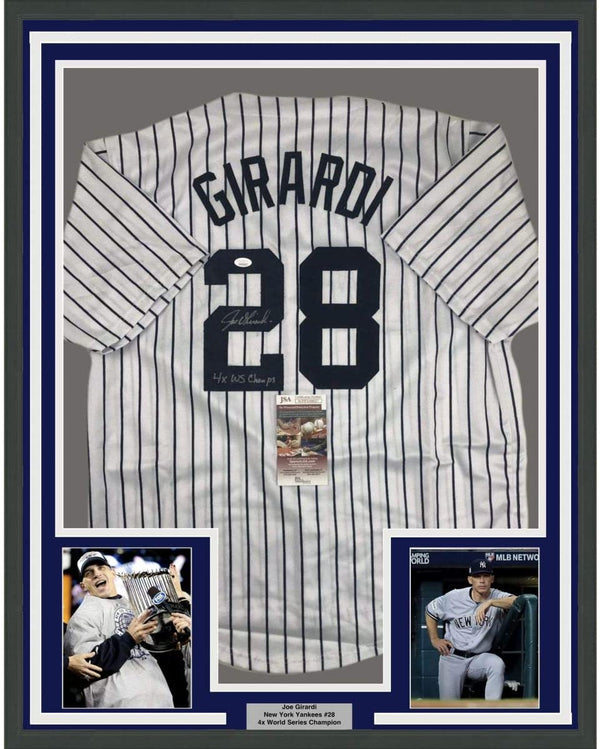 Framed Autographed/Signed Joe Girardi 4x WS Champs 35x39 New York Pinstripe Baseball Jersey JSA COA