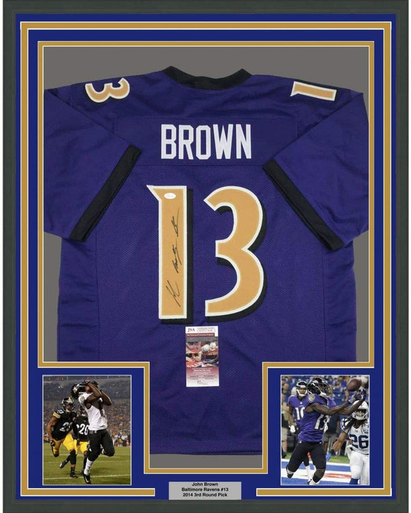 Framed Autographed/Signed John Brown 35x39 Baltimore Color Rush Football Jersey JSA COA