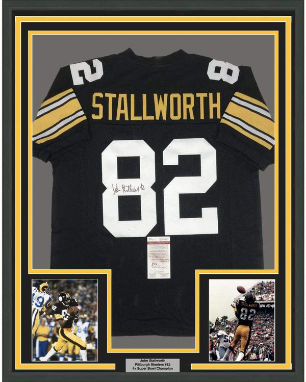 Framed Autographed/Signed John Stallworth 35x39 Pittsburgh Black Football Jersey JSA COA