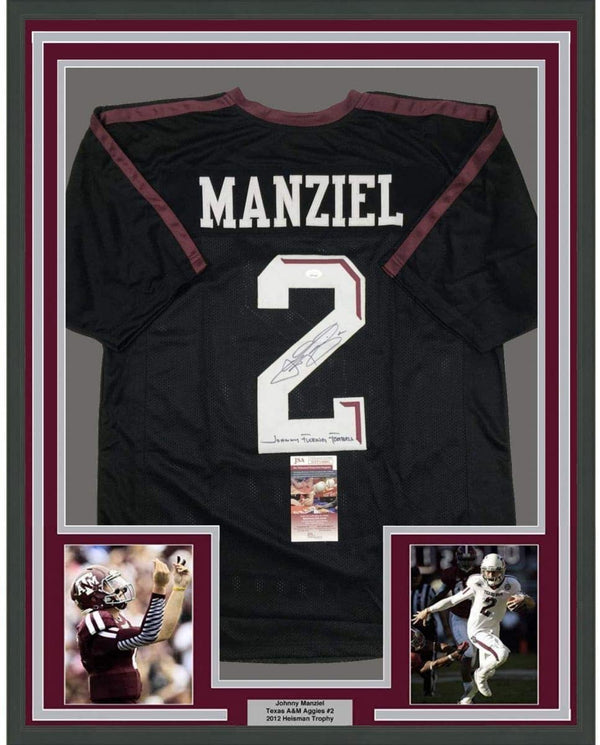 Framed Autographed/Signed Johnny FN Football Manziel 35x39 Texas A&M Black College Jersey JSA COA