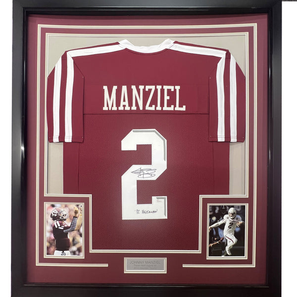 Framed Autographed/Signed Johnny Manziel 12 Heisman 35x39 Texas A&M Maroon College Football Jersey JSA COA