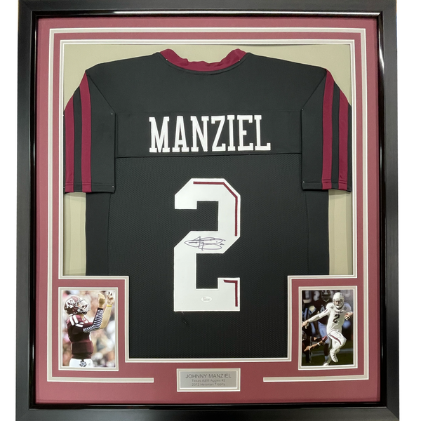 Framed Autographed/Signed Johnny Manziel 35x39 Texas A&M Black College Football Jersey JSA COA