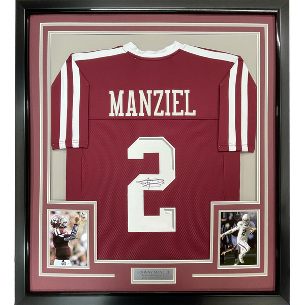 Framed Autographed/Signed Johnny Manziel 35x39 Texas A&M Maroon College Football Jersey JSA COA