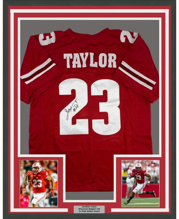 Framed Autographed/Signed Jonathan Taylor 35x39 Wisconsin Red College Football Jersey JSA COA