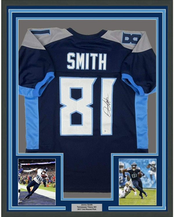 Framed Autographed/Signed Jonnu Smith 35x39 Tennessee Dark Blue Football Jersey Beckett BAS COA