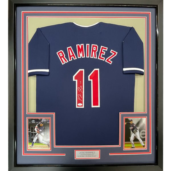 Framed Autographed/Signed Jose Ramirez 35x39 Cleveland Blue Baseball Jersey Beckett BAS COA