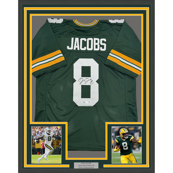 Framed Autographed/Signed Josh Jacobs 35x39 Green Bay Green Football Jersey Beckett BAS COA