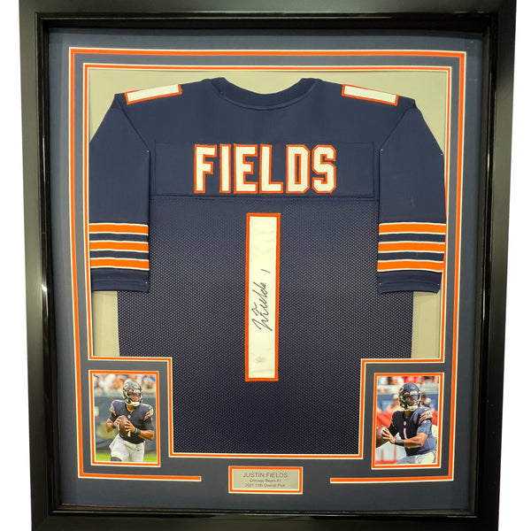 Framed Autographed/Signed Justin Fields 35x39 Chicago Blue Football Jersey JSA COA