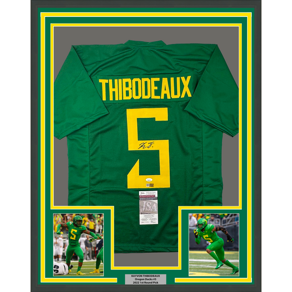 Framed Autographed/Signed Kayvon Thibodeaux 35x39 Oregon Green College Football Jersey JSA COA