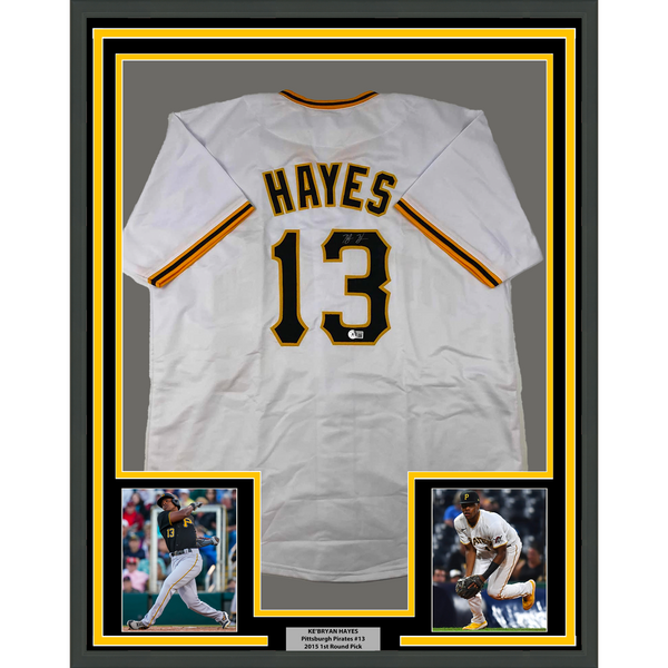 Framed Autographed/Signed Ke'Bryan Hayes 35x39 Pittsburgh White Baseball Jersey Beckett BAS COA
