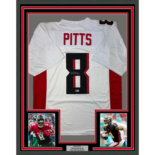 Framed Autographed/Signed Kyle Pitts 35x39 Atlanta White Football Jersey Beckett BAS COA