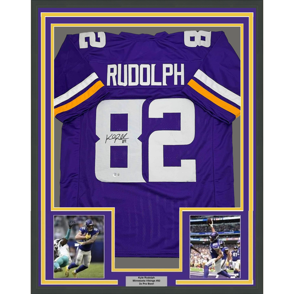 Framed Autographed/Signed Kyle Rudolph 35x39 Minnesota Purple Football Jersey Beckett BAS COA