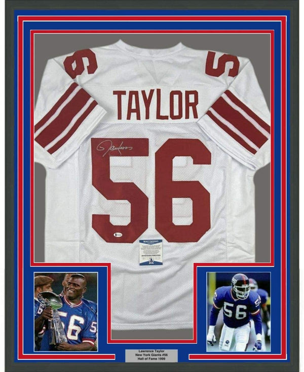 Framed Autographed/Signed Lawrence Taylor 35x39 New York White Football Jersey Beckett BAS COA