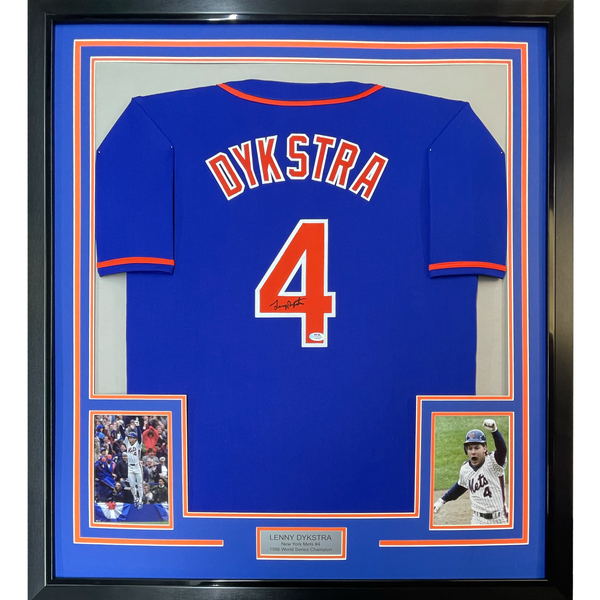 Framed Autographed/Signed Lenny Dykstra 35x39 New York Blue Baseball Jersey JSA COA