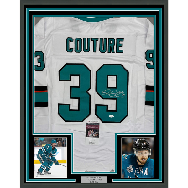 Framed Autographed/Signed Logan Couture 35x39 San Jose White Hockey Jersey JSA COA