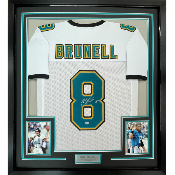 Framed Autographed/Signed Mark Brunell 35x39 Jacksonville White Football Jersey Beckett BAS COA