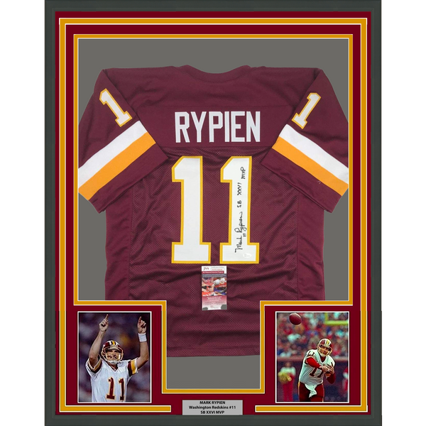 Framed Autographed/Signed Mark Rypien SB XXVI MVP 35x39 Washington Burgundy Football Jersey JSA COA