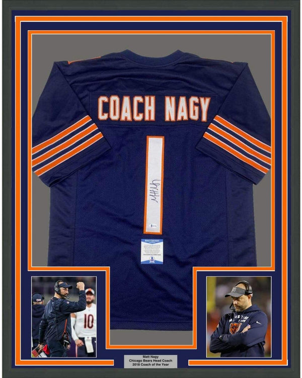 Framed Autographed/Signed Matt Nagy 35x39 Coach Chicago Blue Football Jersey Beckett BAS COA