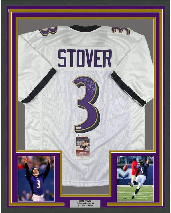 Framed Autographed/Signed Matt Stover 35x39 Baltimore White Football Jersey JSA COA