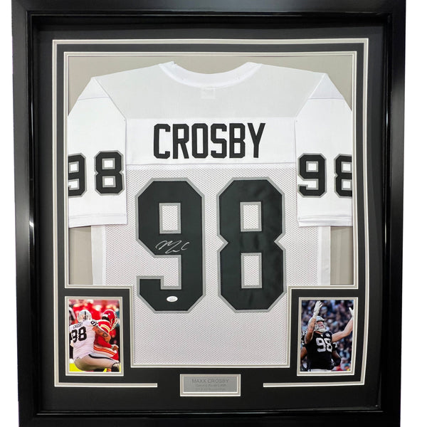Framed Autographed/Signed Maxx Crosby 35x39 Las Vegas Oakland White Football Jersey Beckett BAS COA