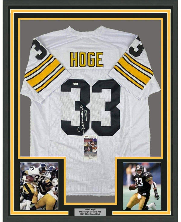 Framed Autographed/Signed Merril Hoge 35x39 Pittsburgh White Football Jersey JSA COA