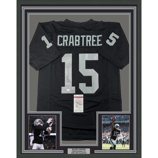 Framed Autographed/Signed Michael Crabtree 35x39 Oakland Raiders Black Football Jersey JSA COA