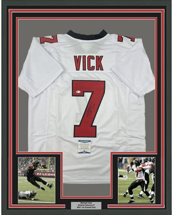 Framed Autographed/Signed Michael Mike Vick 35x39 Atlanta Retro White Football Jersey Beckett BAS COA