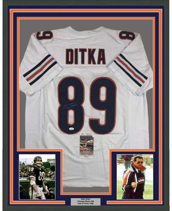 Framed Autographed/Signed Mike Ditka 35x39 Chicago White Football Jersey JSA COA