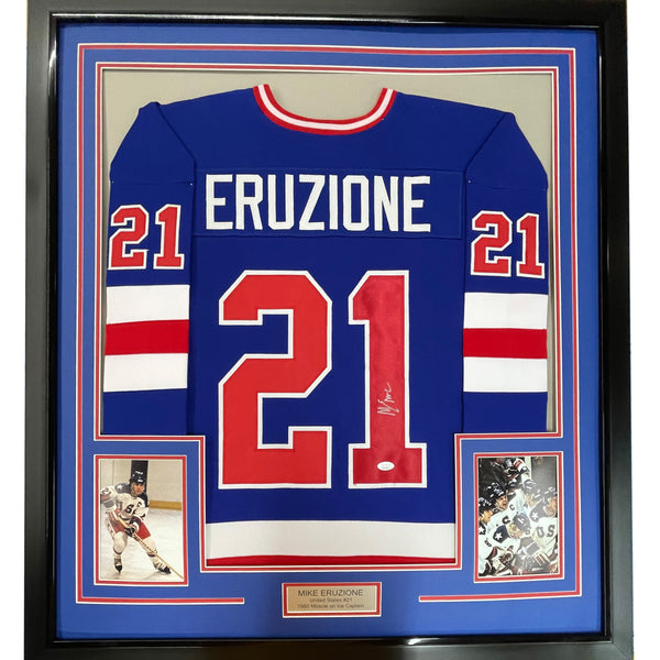 Framed Autographed/Signed Mike Eruzione 35x39 Blue 1980 Miracle On Ice United States Hockey Jersey JSA COA