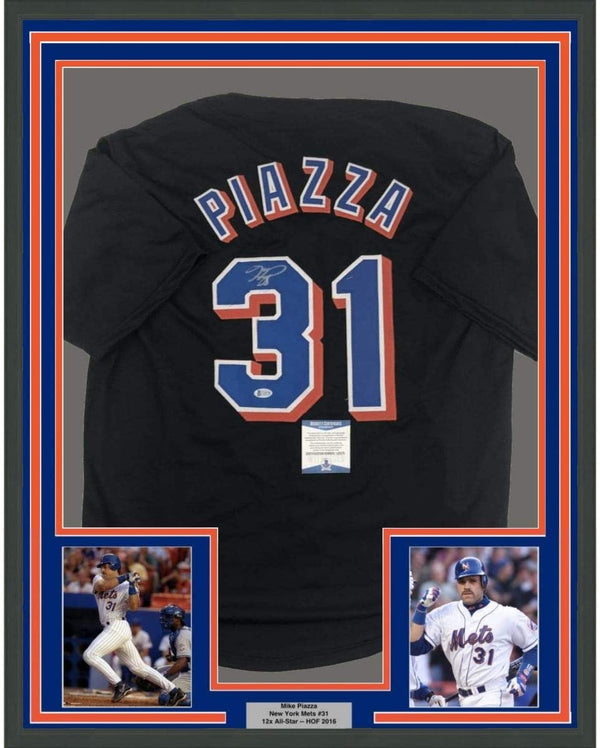 Framed Autographed/Signed Mike Piazza 35x39 New York NY Black Baseball Jersey Beckett BAS COA