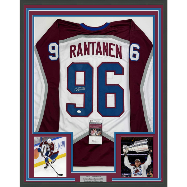 Framed Autographed/Signed Mikko Rantanen 35x39 Colorado White Hockey Jersey JSA COA