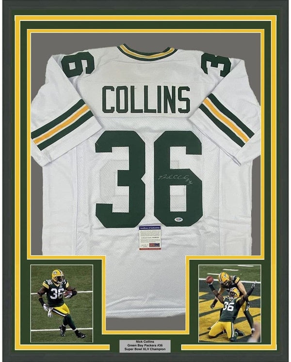 Framed Autographed/Signed Nick Collins 35x39 Green Bay White Football Jersey PSA/DNA COA