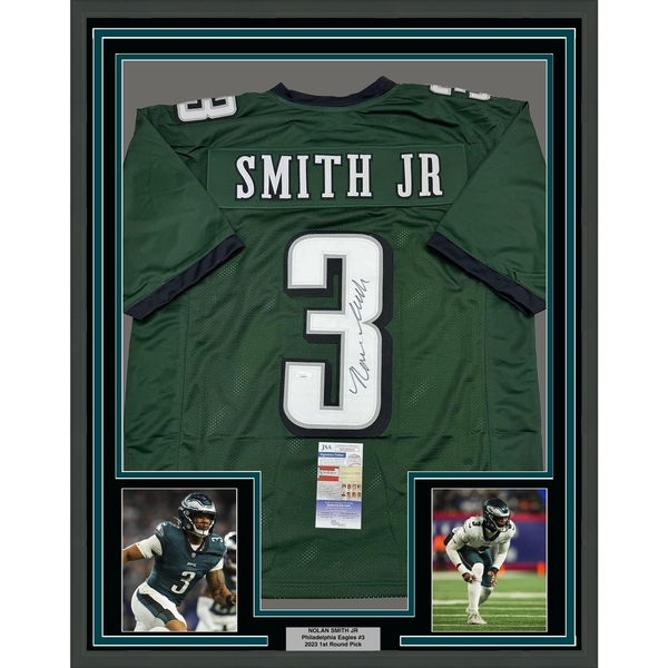 Framed Autographed/Signed Nolan Smith Jr. 35x39 Philadelphia Green Football Jersey JSA COA
