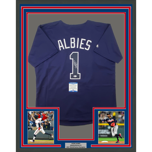 Framed Autographed/Signed Ozzie Albies 35x39 Atlanta Braves Blue Majestic Baseball Jersey Beckett BAS COA