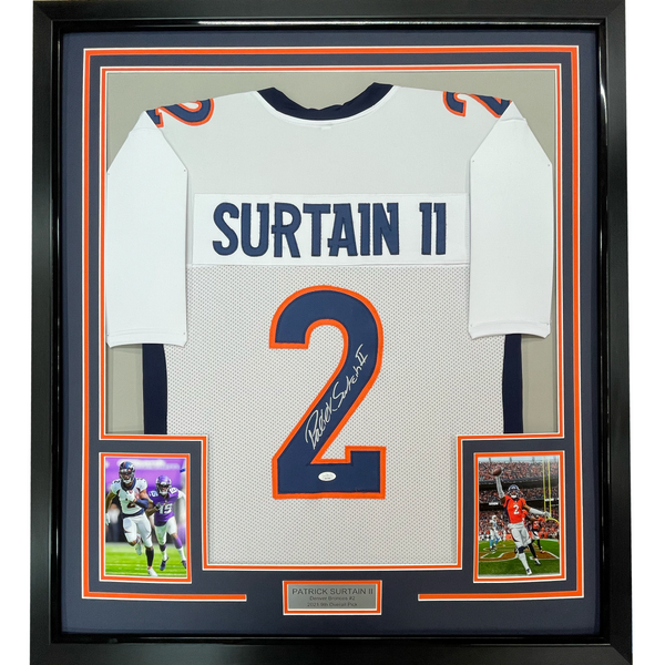 Framed Autographed/Signed Patrick Surtain II 35x39 Denver White Football Jersey JSA COA