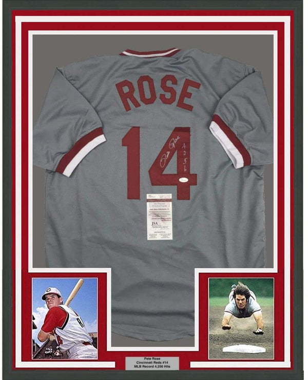 Framed Autographed/Signed Pete Rose 4256 35x39 Cincinnati Grey Baseball Jersey JSA COA