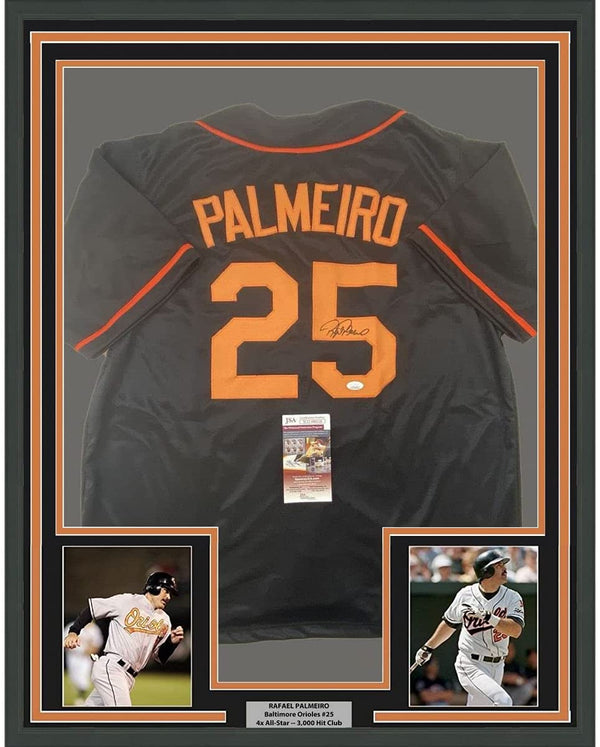 Framed Autographed/Signed Rafael Palmeiro 35x39 Baltimore Black Baseball Jersey JSA COA